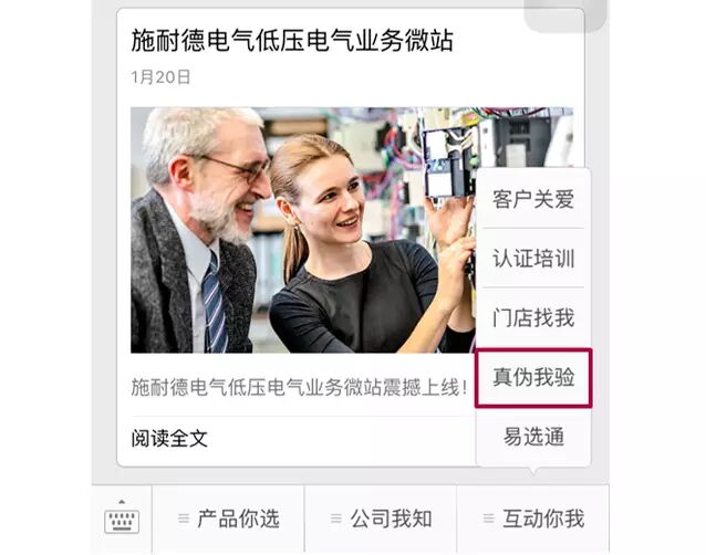 第二步:进入公众号,查找并进入“真伪我验”模块查验真伪